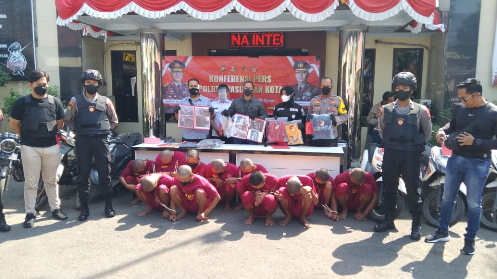 “10 tersangka diduga telah melakukan tindak pidana kekerasan menyebabkan kematian. Sementara satu tersangka melanggar kepemilikan senjata tajam, ” ujar Kasatreskrim Polres Pasuruan Kota, AKP Bima Sakti saat konferensi pers pada Selasa (23/08/2022).
