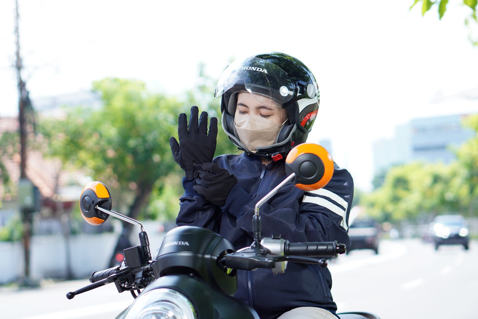 mengenakan jaket, sarung tangan, sepatu yang nyaman, dan tambahkan jas hujan untuk kondisi cuaca seperti saat ini yang sering hujan.