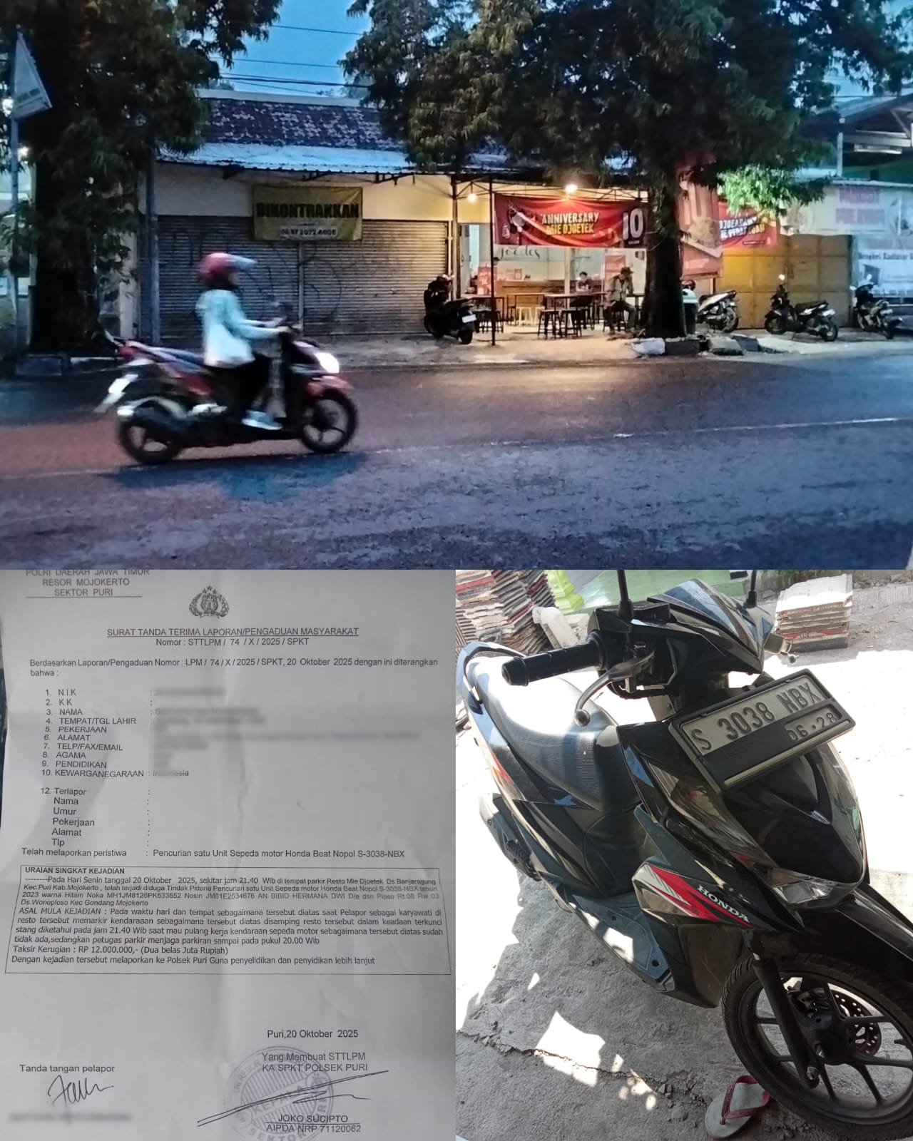 Mojokerto, Kabarpas.com – Berdasarkan Laporan/Pengaduan Nomor : LPM/ 74/X/2025/ SPKT tertanggal 20 Oktober 2025, Septiani Wahyuningsih (26) beralamat di Prajurit Kulon V, Kecamatan Prajurit Kulon, Kota Mojokerto mengalami nasib apes karena sepeda motornya yang terparkir disamping ia bekerja telah digarong maling. Akibat kejadian tersebut ia melaporkan peristiwa pencurian satu unit sepeda motor Honda Beat Nopol S-3038-NBX warna hitam miliknya yang digunakan sehari- hari.