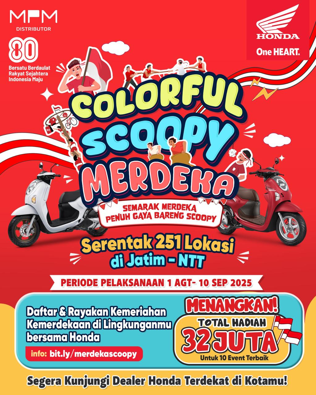 Surabaya, Kabarpas.com – Semarak perayaan Hari Kemerdekaan Republik Indonesia ke-80 semakin berwarna dengan hadirnya kegiatan Colorful Scoopy Merdeka yang digelar PT Mitra Pinasthika Mulia (MPM Honda Jatim), distributor sepeda motor Honda wilayah Jatim & NTT. Mengusung tema “Merdeka Penuh Gaya Bareng Scoopy”, kegiatan ini berlangsung serentak di 251 lokasi mulai 1 Agustus hingga 10 September 2025.