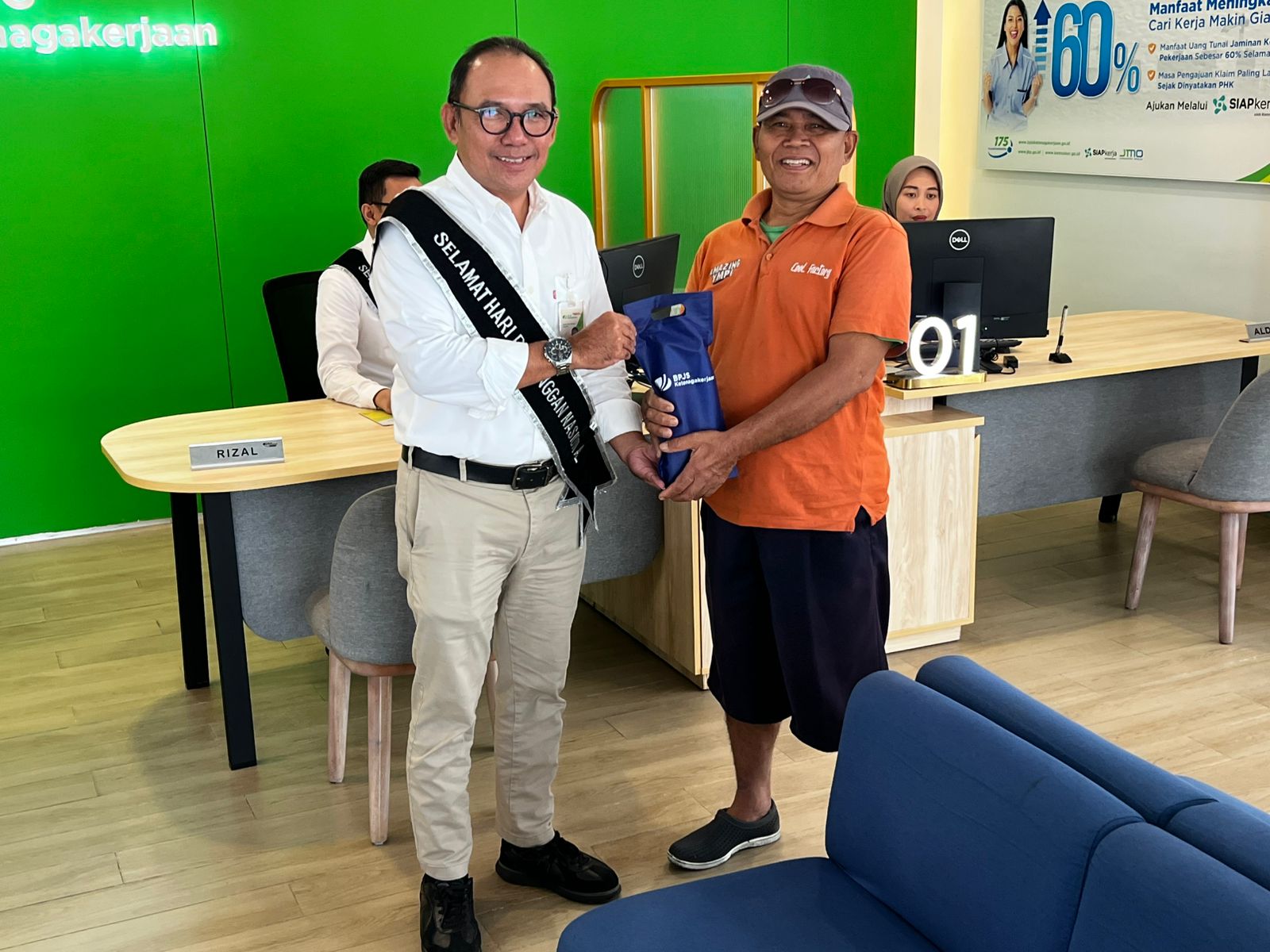 Dalam rangka Harpelnas 2025 ini, Kepala BPJS Ketenagakerjaan Kantor Cabang Pasuruan, Sulistijo N. Wirjawan turun langsung melayani dan menyapa peserta yang hadir dan datang ke Kantor BPJS Ketenagakerjaan Pasuruan.