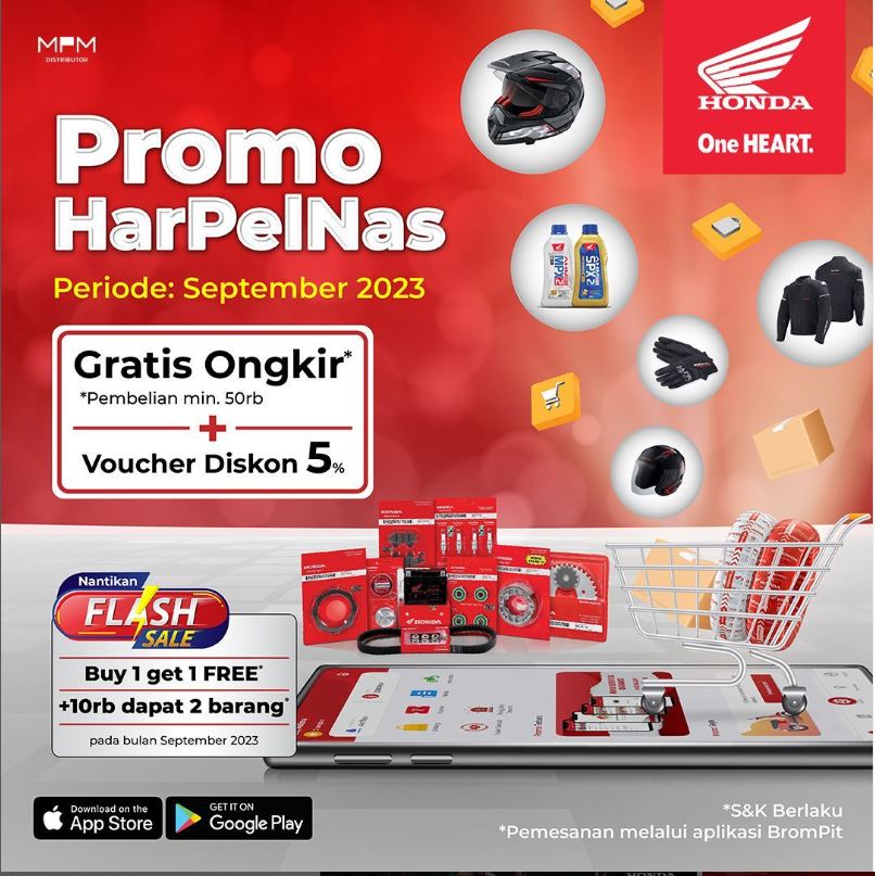 Bertajuk Promo Harpelnas, setiap pembalian pembelian oli dan sparepart senilai minimal Rp.50 ribu melalui aplikasi Brompit akan mendapatkan gratis ongkir serta tambahan voucher diskon sebesar 5%. Sparepart dan aksessories motor Honda yang tersedia dalam aplikasi adalah sparepart Honda Genuine Parts.