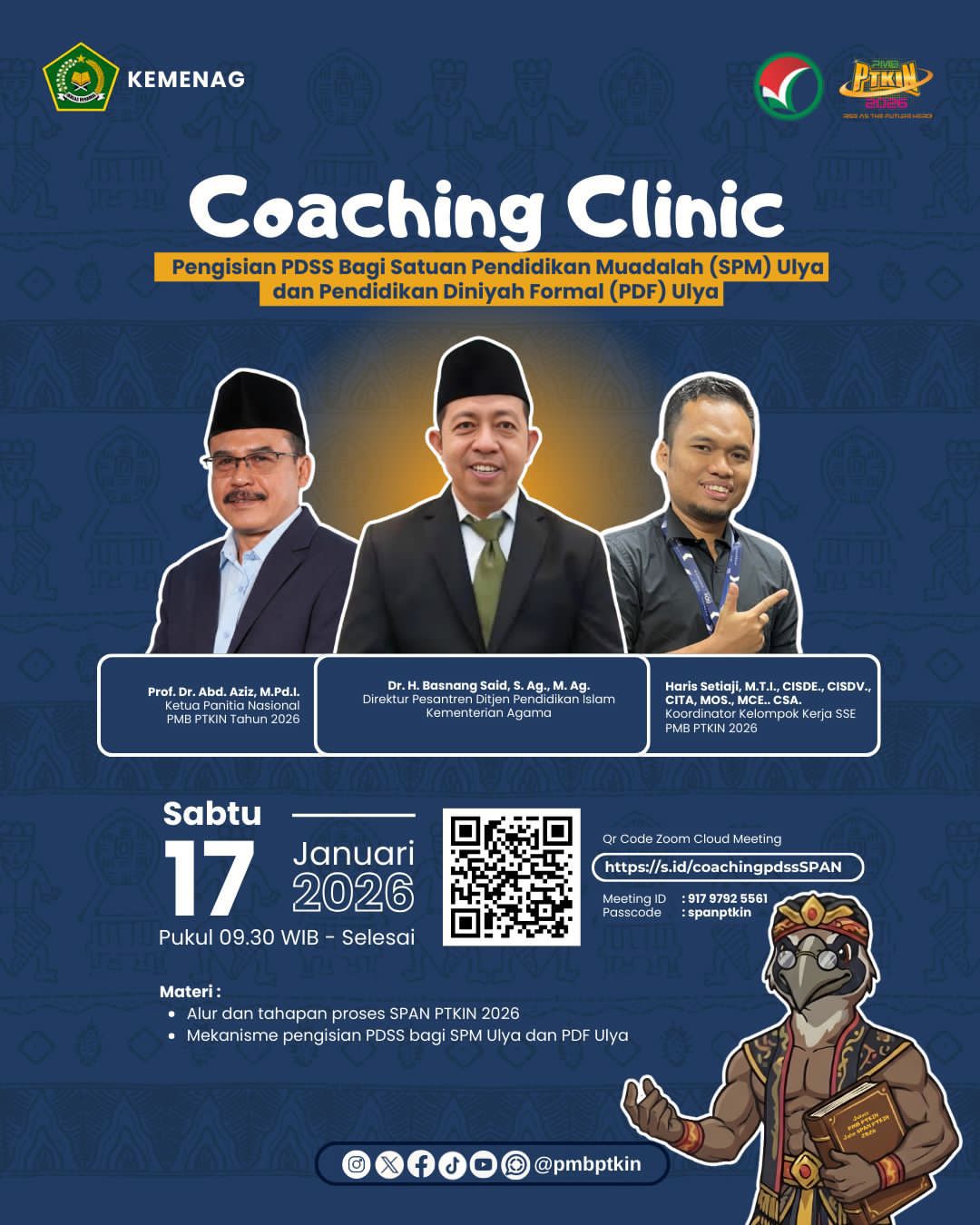 Ketua Panitia Nasional PMB PTKIN 2026, Prof. Dr. Abd. Aziz, M.Pd.I., menjelaskan bahwa keberhasilan pelaksanaan seleksi sangat bergantung pada ketepatan data awal yang diinput oleh operator sekolah atau pondok pesantren. Beliau merefleksikan bahwa langkah untuk “memberikan perhatian khusus” melalui coaching clinic ini adalah bentuk tanggung jawab moral untuk memastikan setiap santri memiliki hak yang sama, seraya menekankan bahwa PDSS adalah pintu pertama bagi santri untuk melangkah ke jenjang perguruan tinggi negeri.