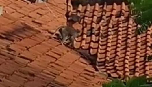 Monyet tersebut berpindah-pindah dari pohon, tiang listrik hingga ke atap-atap rumah warga.