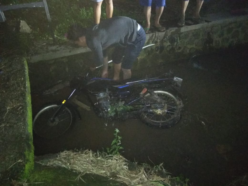 Petugas bersama warga sempat mengalami kesulitan, saat mengangkat motor dari aliran irigasi karena motor masuk kolong jembatan irigasi sejauh hampir 1 motor. (umr/diz).
