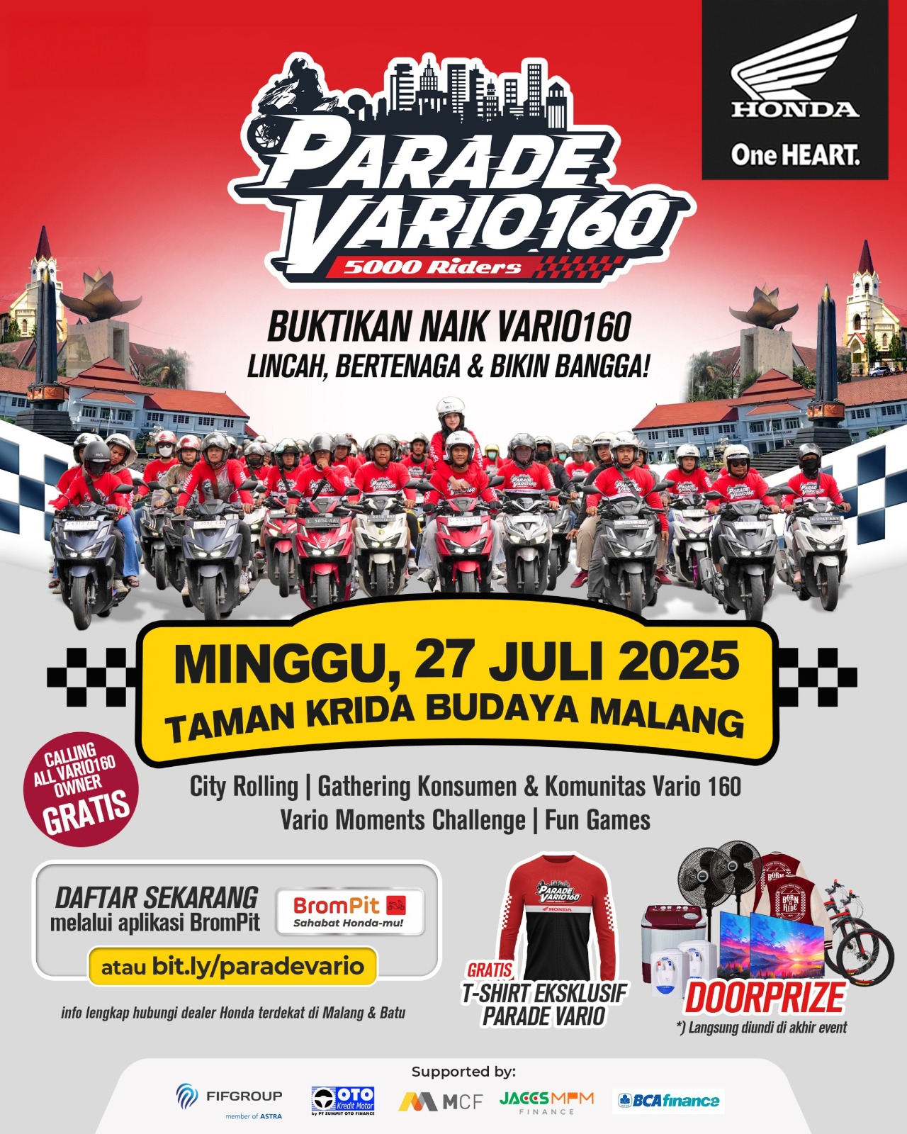Parade ini akan diawali dengan city rolling menyusuri ikon-ikon kota Malang. Para peserta akan merasakan performa tangguh Honda Vario 160 yang dibekali mesin 160cc eSP+, fitur Honda Smart Key System, bagasi luas 18 liter, hingga desain sporty yang cocok untuk mobilitas di area perkotaan maupun perjalanan jarak menengah. Start kegiatan akan dimulai dari Taman Krida Budaya Malang.