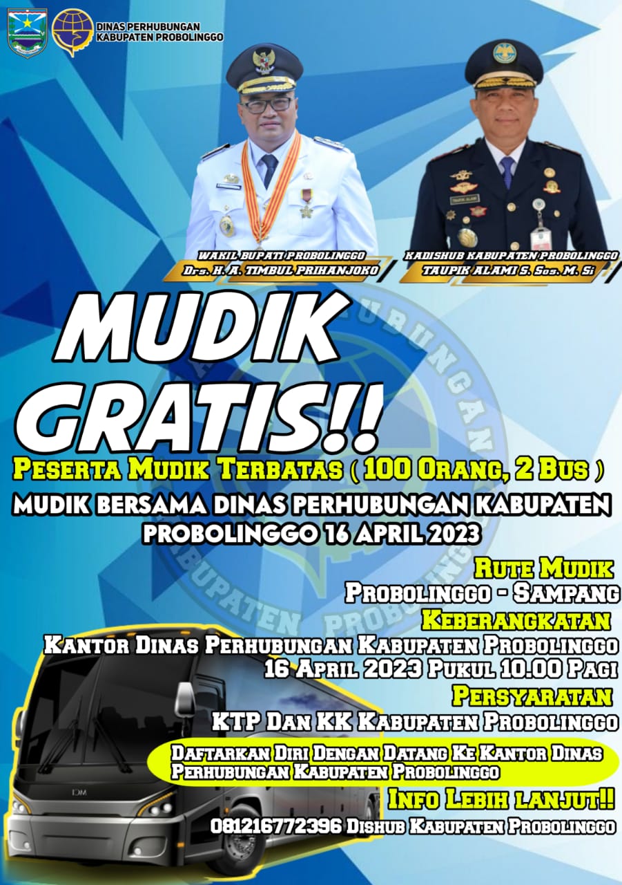 Rencananya mudik gratis ini akan dilepas pada 16 April 2023 mendatang dari Kantor Dishub Kabupaten Probolinggo sekitar pukul 10.00 WIB. Untuk bisa mengikuti program mudik gratis ini harus KTP dan KK Kabupaten Probolinggo.