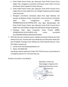 Pasuruan, Kabarpas.com – Komisi Pemilihan Umum (KPU) Kota Pasuruan membuka Pengumuman Pendaftaran Pasangan Calon Walikota dan Wakil Walikota Pasuruan untuk Pilkada Tahun 2024. Berikut jadwal dan persyaratannya: