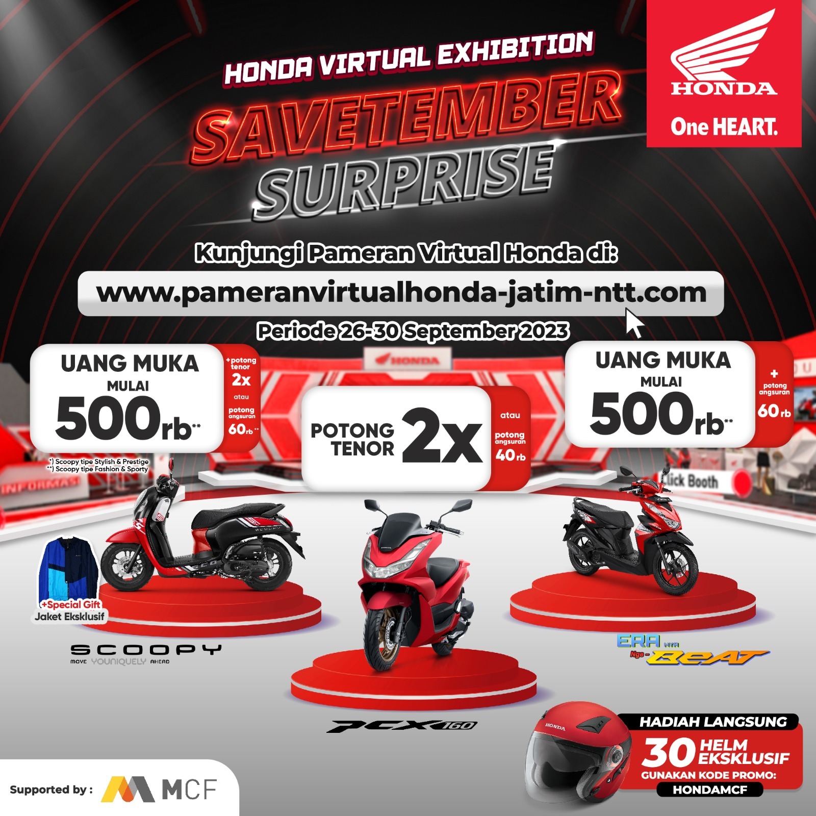Melalui program Savetember Surprise, MPM Honda Jatim memberikan hadiah langsung Helm gratis untuk 30 konsumen yang melakukan pembelian melalui Honda Virtual Exhibition dengan memasukkan kode promo HONDAMCF saat melakukan transaksi. Bersama dengan jaringan dealer Honda wilayah Jatim & NTT, Honda Virtual Expo digelar hingga 30 September 2023.