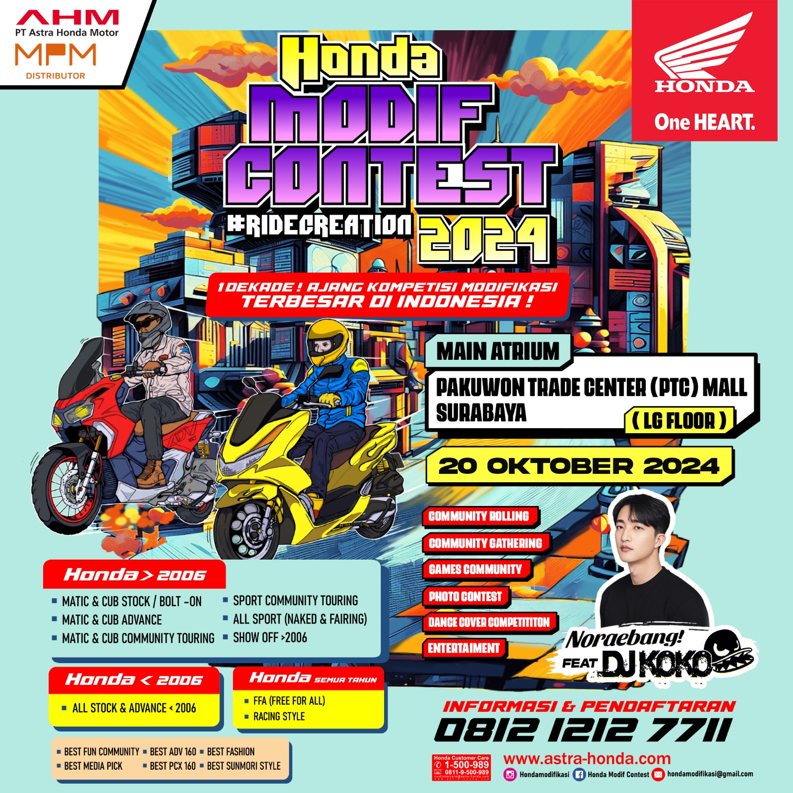 Surabaya, Kabarpas.com – Helatan modifikasi sepeda motor terbesar di Tanah Air Honda Modif Contest (HMC) 2024 #RIDECREAT10N akan digelar di Surabaya. Memasuki satu dekade pelaksanaannya, HMC tahun ini menawarkan konsep yang lebih segar, kekinian, dan menjangkau lebih banyak kota untuk mewadahi kreativitas modifikator di berbagai segmen dan level khusunya di Jawa Timur.