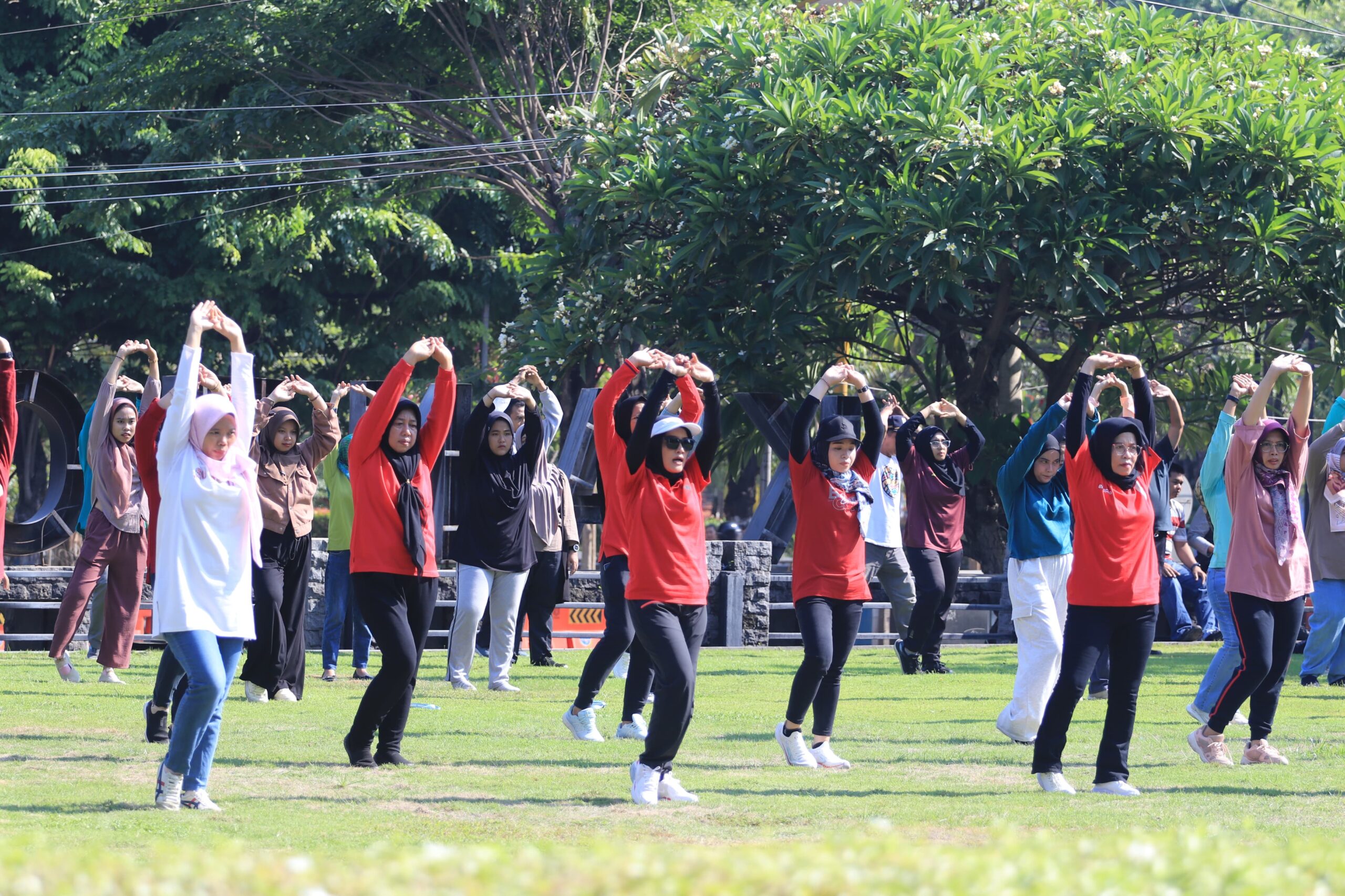 Kegiatan senam bersama ini dimulai sekitar pukul 07.00 WIB. Meskipun cuaca sangat terik dan panas, peserta yang terdiri dari berbagai kalangan ini tampak antusias dan kompak mengikuti gerakan senam yang dipandu oleh instruktur. Melalui kegiatan ini, mereka tidak hanya berolahraga, tetapi juga mempererat hubungan sosial antar instansi dan masyarakat.