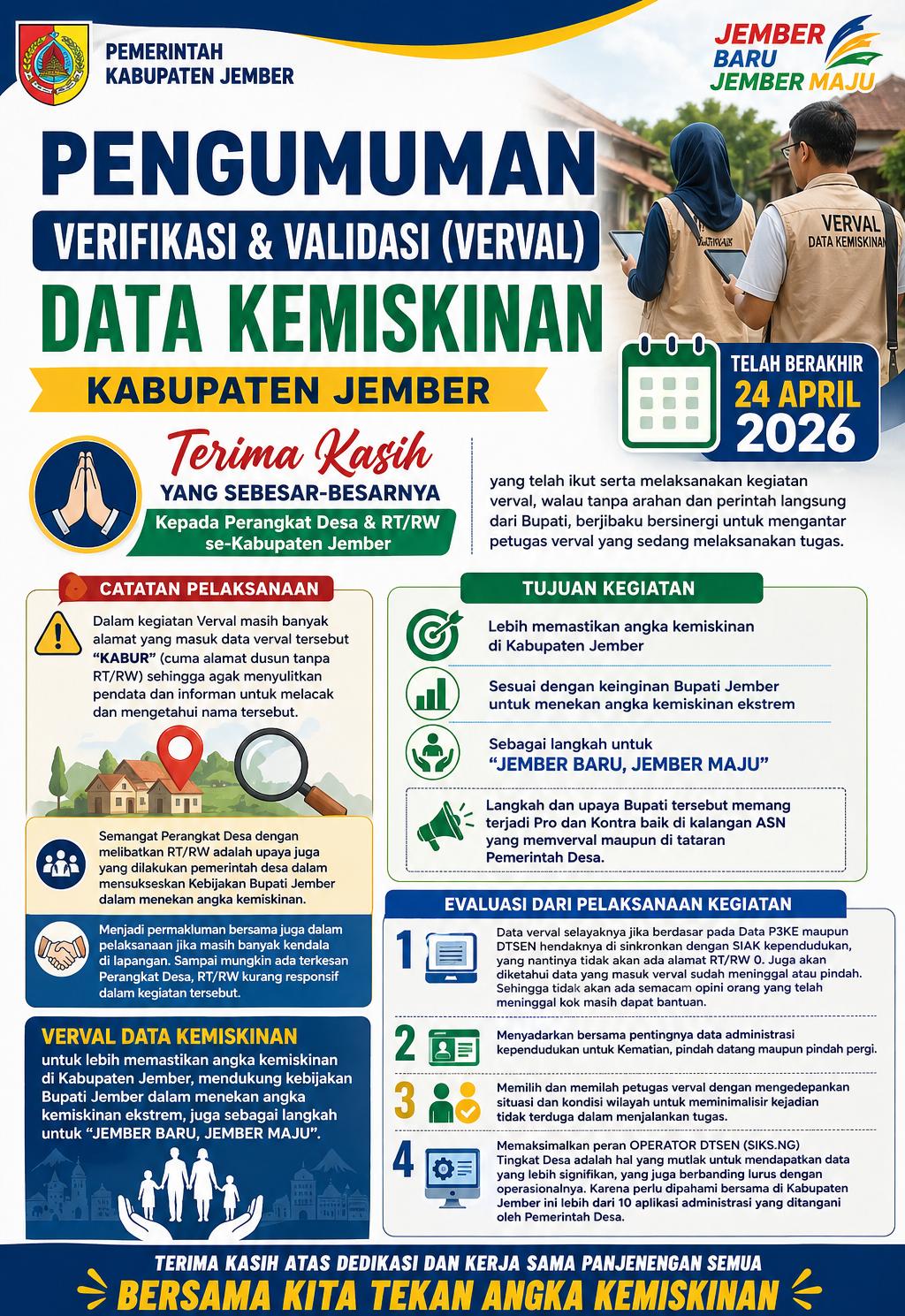 Jember, Kabarpas.com – Kegiatan verifikasi dan validasi (verval) data kemiskinan yang digelar Pemerintah Kabupaten Jember resmi berakhir pada 24 April 2026. Program yang melibatkan sekitar 20 ribu Aparatur Sipil Negara (ASN) ini menjadi salah satu langkah strategis pemerintah daerah dalam memastikan akurasi data warga miskin sekaligus menekan angka kemiskinan ekstrem.