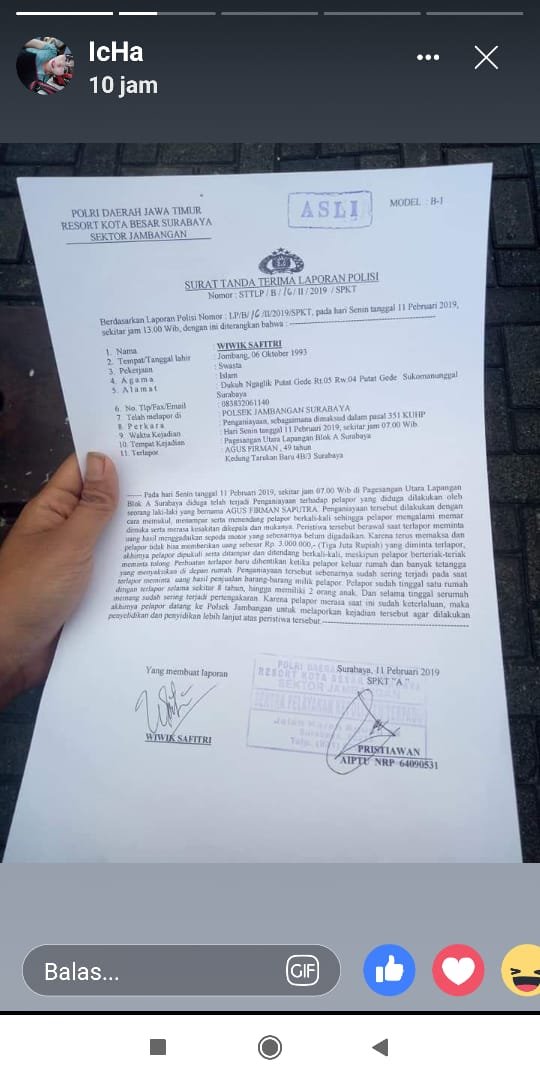 Usai mengalami aksi kekerasaan dan mendapat dukungan dari netizen, Icha langsung melaporkan kasus ini Senin kemarin (11/2) di Polsek Jambangan. (dem/mey).